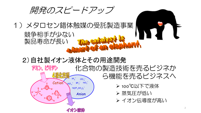 このイオン液体事業は、常にアンテナを張って用途開発をし続けなければなりませんが、この新規事業を通して、それまでの化合物の製造技術を売るビジネスから機能を売るビジネスへと新しいビジネス形態を導入することができました。