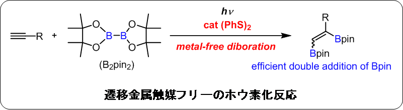 そこで着目したのが光反応です。光照射することでホウ素の活性種を発生させ、その活性種を利用して有機ホウ素化合物が作れるのではないかと考え、ラジカル反応を利用した新しい反応の開発に成功しました。