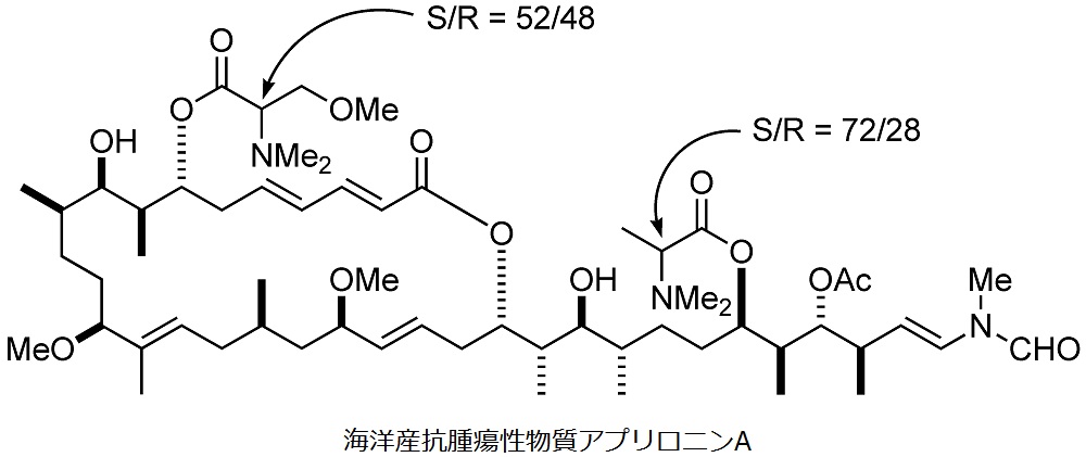 1993年にアプリロニンを単離し、1994 年には化学構造を決定、全合成にも成功しました。先ほど約100段階かかったとお話ししたのは、このアプリロニンの全合成です。また、がん細胞を植え付けたマウスにアプリロニンを与えると、延命率が5倍以上になることを確認しました。これほど延命率が高い薬は極めて稀で、非常に注目されています。