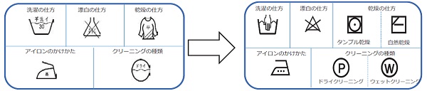 平成28年12月1日から、衣類等の繊維製品の洗濯表示が新しいJIS L0001に規定する記号に変更された。(図は消費者庁ニュースリリース(平成28年11月4日)より転載)