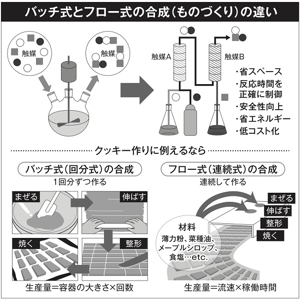 小林 基礎研究の成果を社会に役立ててほしいとの思いで立ち上げたのが「フロー精密合成コンソーシアム(FlowST)」です。医薬品に代表されるような高機能品は(製造工程ごと)釜で作る「バッチ式」による製造です。石油化学では連続の「フロー式」を採用していますが、少し構造が難しくなるとフローでは対応できず釜で作ろうということになっていました。しかし技術が進むとフローで対応できるようになります。例えばセルロースからずっと流しながら連続で、最後には薬とか液晶を作ることもできると思います。