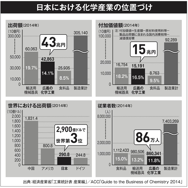 湯本 素材産業(金属関係を除く)は日本の雇用者数、付加価値額の2割程度を占めます。自動車産業と肩を並べる規模です。そのうち化学は7〜8割を占めています。川上の素材メーカーは必然的に(川下の)強い海外勢と組まざるを得なくなっており、「すり合わせ」が強化されてますます海外の川下が強くなってしまう現状を変革していかなければなりません。