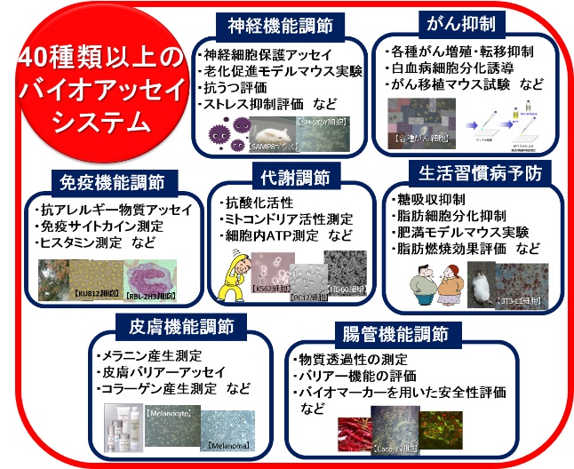 私の研究室には、新たに開発したものから、既存の手法を改良したものまで、約40種類のバイオアッセイがあります。神経細胞、筋肉細胞、脂肪細胞、骨の細胞、皮膚細胞、腸管細胞など、細胞毎にモデルをつくりました。これにより、神経機能調節、免疫機能調節、代謝調節、皮膚機能調節、腸管機能調節、がん抑制、生活習慣病予防などの機能性を評価することができます。おそらく、これほど多数のバイオアッセイを持っているところは他にないと思いますし、網羅的な機能性解析のツールとして改良して行きたいと考えています。