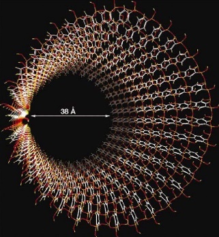 私が手がけたのは、粘土鉱物とポリマーのハイブリッド材料を作る研究です。粘土鉱物は層状の構造をしていますが、層をバラバラにして1nmの非常に薄い板とし、それをナイロンのポリマーの中に分散させます。たまたまカネマイトという粘土鉱物をナイロンと複合化しようとしたとき、層がバラバラにならず、湾曲して層同士がくっついて穴ができてしまいました。そうして偶然にできたのが、メソポーラスシリカだったのです。