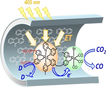 東京工業大学の石谷治先生が研究されているレニウム錯体という光触媒は、光を当てると二酸化炭素(CO2)を一酸化炭素(CO)に還元する性質があります。これをメソポーラス有機シリカの穴に入れると、光捕集アンテナ機能によって光エネルギーが集まり、光触媒機能が増強されることを確認しました。