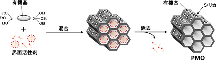その通りです。国家プロジェクト(CREST「有機シリカハイブリッド材料のナノ構造制御と機能創出」(2006〜2011))で、さまざまな有機基を作成して骨格に導入し、メソポーラス有機シリカの種類を増やすとともに、機能性を高める研究を集中的に進めました。