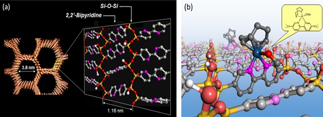 (a) BPy-PMOと(b)イリジウム錯体を固定したBPy-PMOの細孔表面の構造モデル