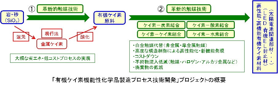経済産業省が新しく立ち上げた「未来開拓研究プロジェクト」の中で、第1号となるテーマの1つが「有機ケイ素機能性化学品製造プロセス技術開発」です。産総研が集中研(各参加企業の研究員が一つの研究機関に集まる研究開発方式)となり、企業3社、大学4校と共同で研究を進めています。研究課題は2つあって、1つは砂から有機ケイ素原料を省エネかつ低コストで作るための触媒技術の開発、もう1つが有機ケイ素原料から新しい高性能な材料(シリコーン)を作る触媒技術の開発です。
