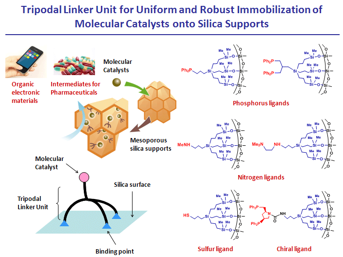 We have developed a tripodal linker unit that enables firm immobilization of molecular catalysts on silica. The silica-immobilized amino-palladium complex catalyst via the tripodal linker is effective for preventing metal leaching into the product after the Suzuki coupling reaction.