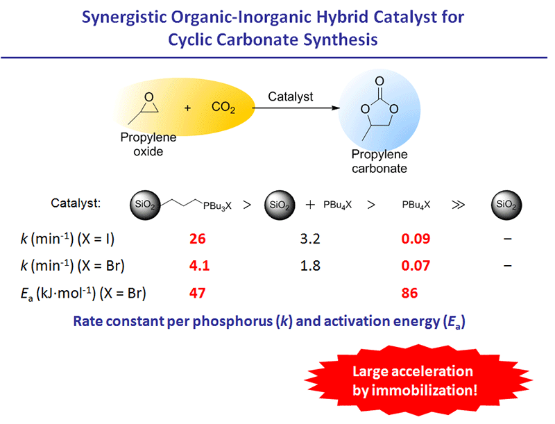 The catalytic activity of onium salts towards cyclic carbonate synthesis from propylene oxide and CO2 is enormously enhanced by their immobilization onto silica that itself has no catalytic activity.