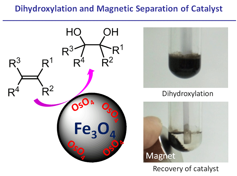 We have developed magnetically recoverable osmium catalysts. By employing 2 mol% of the magnetic osmium catalyst, the dihydroxylation reaction proceeds smoothly to provide the vicinal diol. The catalyst is readily recovered by use of an external magnet, and is reused repeatedly.