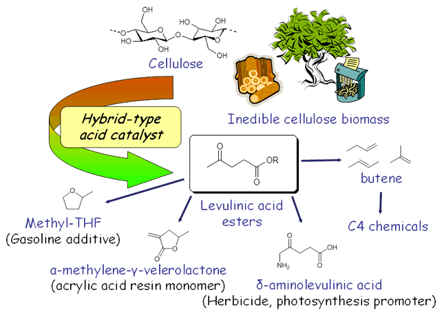 We have developed a new catalyst which directly converts cellulose, a main component of plants, into levulinic acid esters in good yields. Levulinic acid is promising as a key building block for fuels, polymers, and fine chemicals.