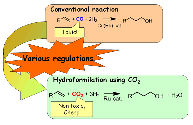 Hydroformylation (oxo reaction) is one of the key processes in the chemical industry to produce more than 10 million tons of chemicals every year. We have developed new hydro-formylation using CO2 as a reactant in place of toxic CO.