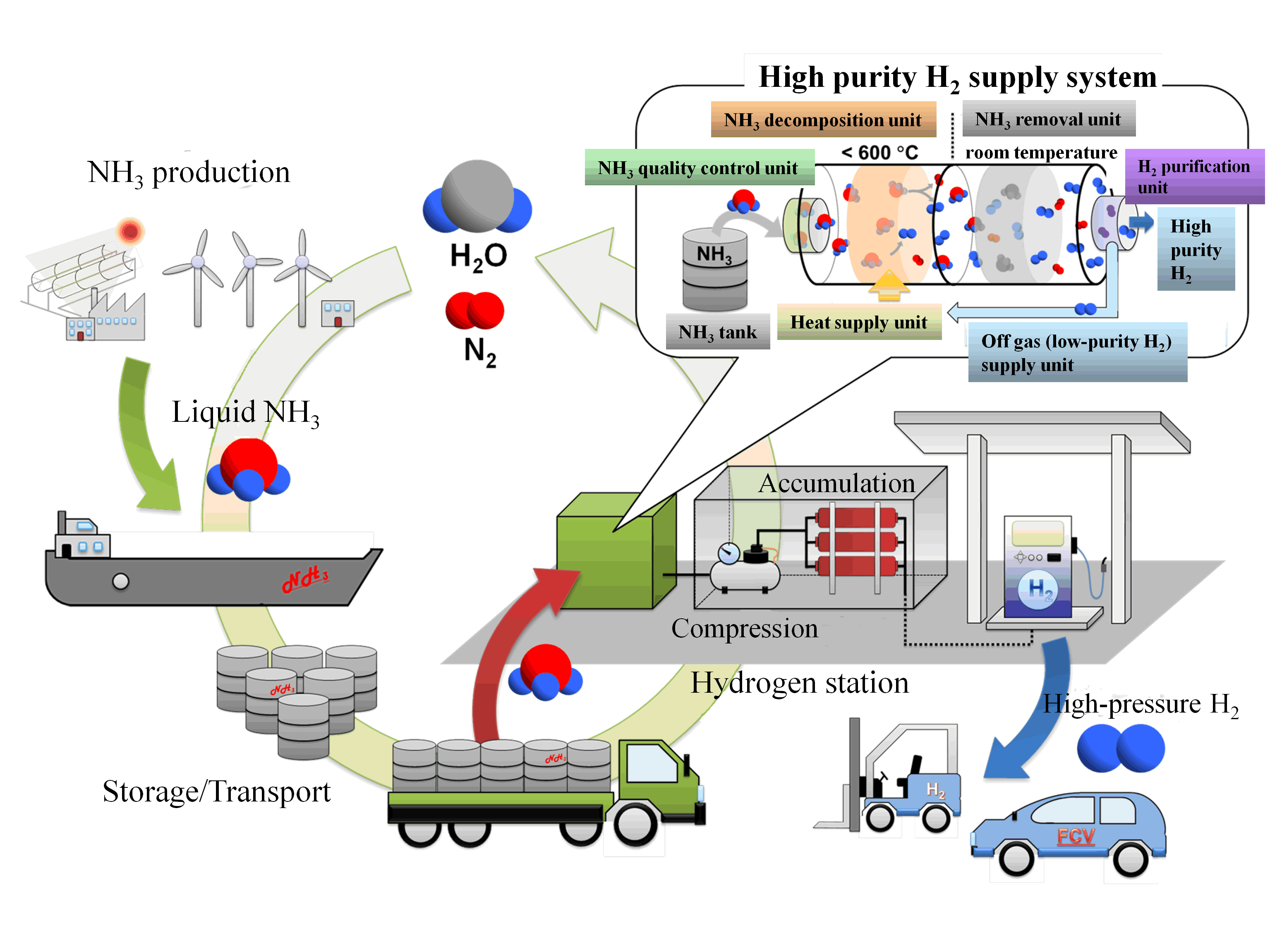 In recent years, hydrogen is considered as a clean energy source to avoid environmental pollution. However, the low energy density of hydrogen in both compressed gas and liquid forms makes the storage of hydrogen difficult for most of the applications. This limitation most strongly effects onboard storage and also in the delivery and distribution of hydrogen. Hydrogen’s low energy density is perhaps one of the greatest barriers to the implementation of hydrogen fueled fuel cell vehicles. Since the hydrogen is difficult to transport, the liquid ammonia is considered as an alternative energy carrier. The two important factors make ammonia a candidate of choice. Firstly, its high energy density and the vapor pressure (9.2 bars at room temperature) make its storage simple and inexpensive. Secondly, ammonia has a large weight fraction of hydrogen. Hydrogen constitutes 17.65% of the mass of ammonia. Moreover, ammonia can be easily decomposed over a catalyst to produce hydrogen (H2) along with nitrogen (N2) a non-toxic, non-greenhouse gas. Hence, the development of the high purity hydrogen supply systems based on ammonia is expected to promote the spread of the fuel-cell vehicles due to reduced costs of hydrogen supply infrastructure. Furthermore, ammonia production is a well-established and economical technology.