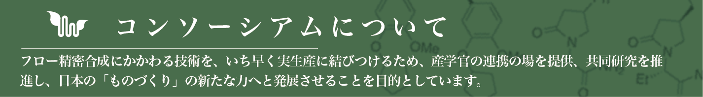 化学合成技術のひとつであるフロー法は、環境負荷の低減、効率性、安全性の面で多くの利点を持ちながらも、化成品や精密化学品などの複雑な構造を有する化合物の合成や多段階の反応を必要とする合成は困難とされてきました。2015年4月、東京大学の小林教授は、多段階フロー合成システムを構築することで、フロー法のメリットをそのままに、構造的に複雑な化合物(医薬品)を合成することに成功しました。 本コンソーシアムは、産総研と東京大学が中心になり、企業・大学・公的研究機関の技術交流の場を提供し、フロー法による化成品や精密化学品の製造を実現すべく、関連する科学技術(触媒、反応、計測、分離、乾燥等)の向上及び普及を促進し、日本の「ものづくり」の新たな力へと発展させることを目的として、化成品や精密化学品のフロー合成に関連した技術の情報交換・提供、共同研究の提案・実施の推進等を行っています。