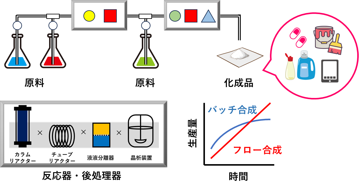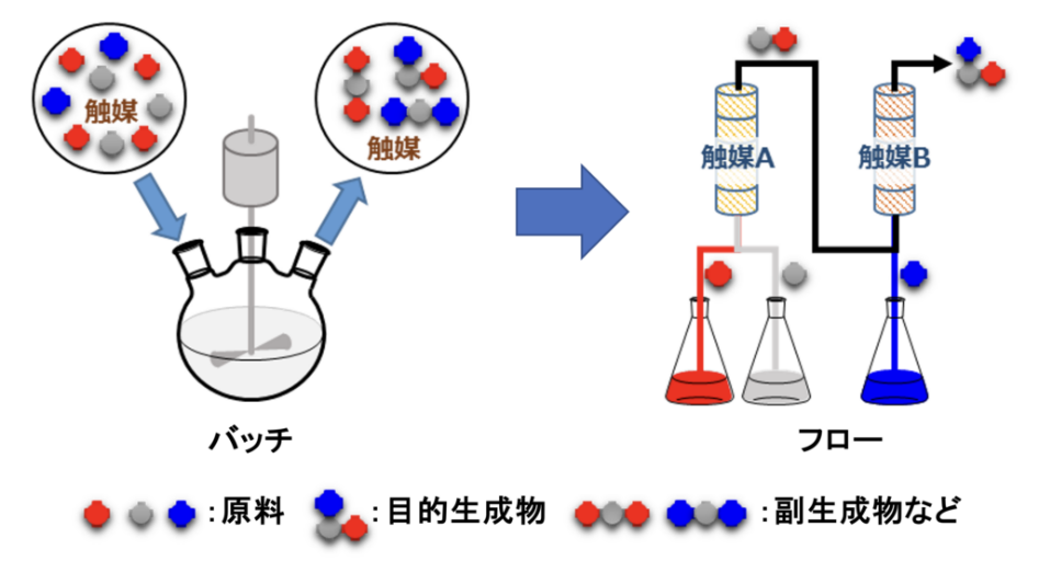 フロー合成とは、原材料を装置に流しながら、反応などの化学処理を連続的に行う合成手法です。フロー合成は、フラスコなどで行うバッチ合成とは異なり、精密に反応を制御できる特徴があります。様々な工程を順番に連結させれば、複数の処理を逐次的に進めることもできます。究極的には、原料から製品まで一気通貫の合成システムを構築し、「蛇口から製品が出てくる」世界の実現が見込まれます。この技術は、化学合成の自動化と相性がよく、省エネルギ―、省人、省廃棄物等の観点から素材の製造にかかる「コスト」を低減し、人々のくらしの豊かさの向上に貢献します。フロー化学研究グループでは、精密医薬品から高分子に至る幅広い機能性分子を標的として、触媒開発、装置開発、有機合成等様々な視点から、フロー合成技術の開発を行っています。
