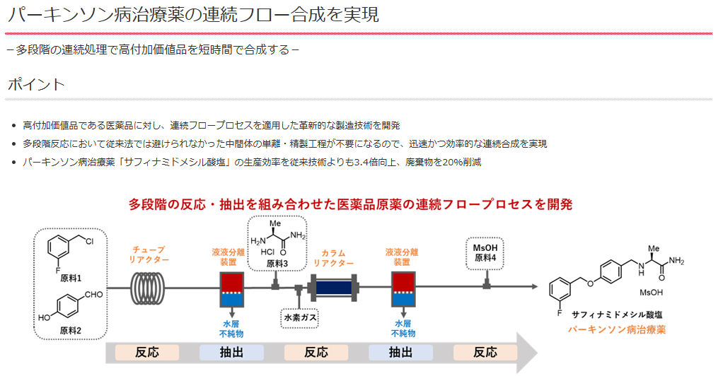 産総研:パーキンソン病治療薬の連続フロー合成を実現