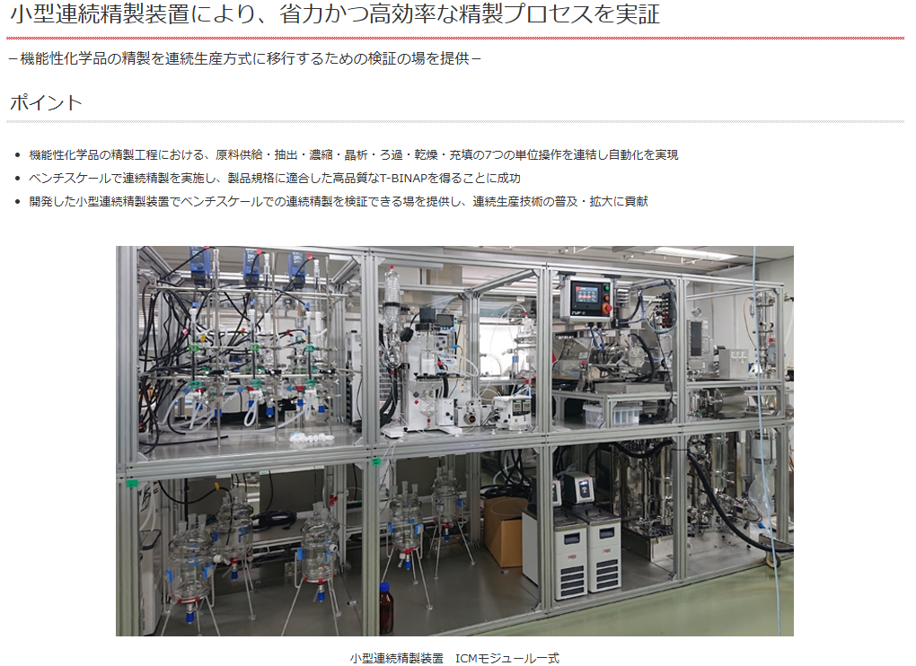 - プレスリリース「小型連続精製装置により、省力かつ高効率な精製プロセスを実証」