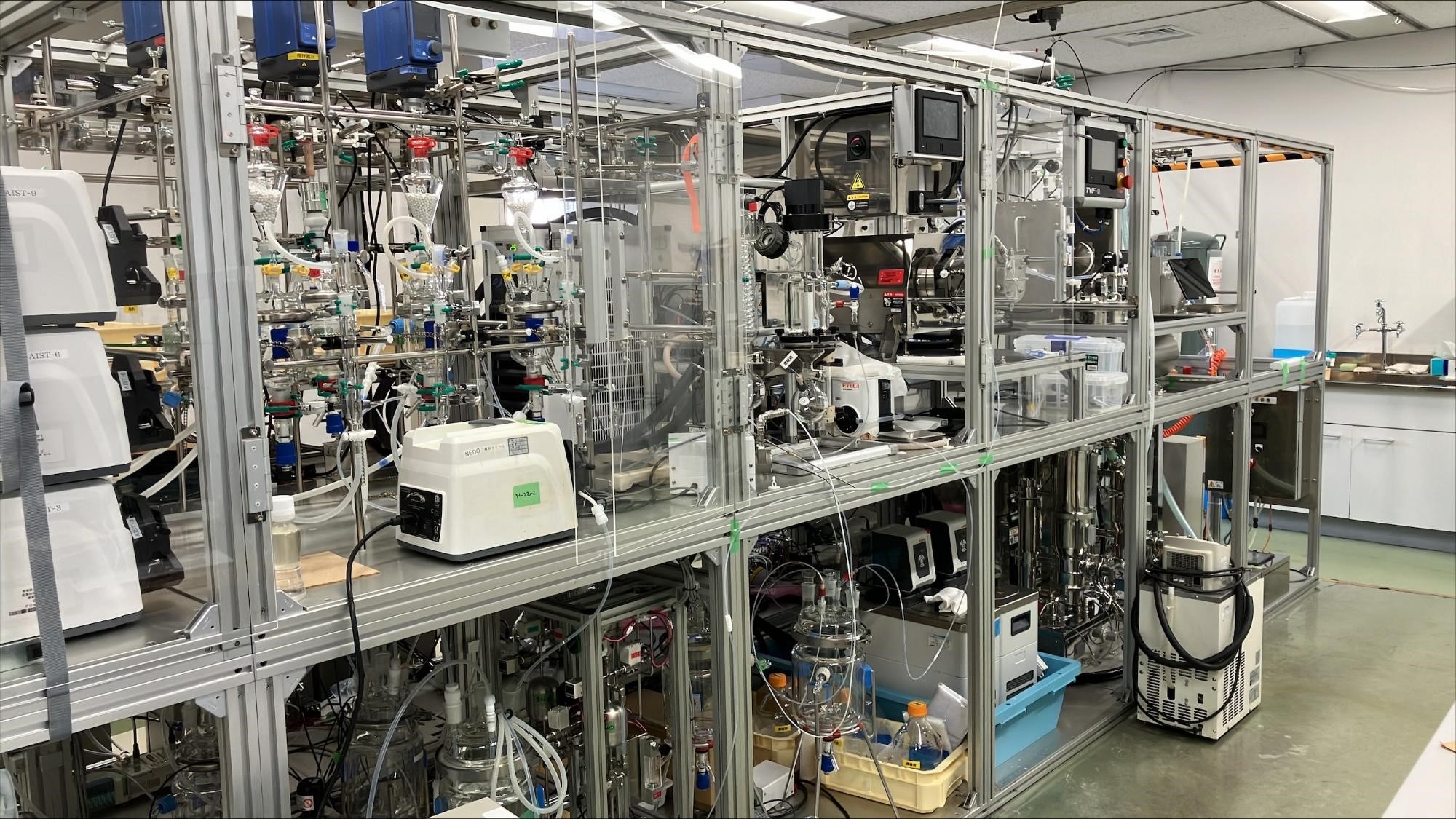 有機合成では反応の後に必要な、生成物の純度を高める精製工程(抽出洗浄、濃縮、晶析、ろ過、乾燥など)も重要です。これらの後工程プロセスの連続化が可能な装置群を導入し、反応から精製までの連続プロセスを研究しています。製造における省エネルギー・廃棄物を削減し、機能性化学品の製造プロセスの自動化を目指しています。これまでに、企業の研究者と共同して、機能性化学品の連続生産に関するプロセスの構築を行ってきました。写真はその成果物の一つとして触媒化学研究部門に導入されている「ICM(Integrated Continuous Manufacturing)モジュール」です。有機合成の後工程プロセスである抽出・洗浄、濃縮、晶析、ろ過、乾燥のそれぞれの単位操作を連続で行うことができる装置を1mキューブに備え、単位操作のみならず、単位操作間の連続化が可能な装置群です。