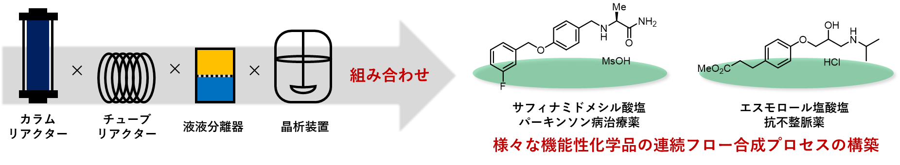 医薬品や農薬などの機能性化学品の連続フロー合成技術に関して研究を行っています。様々なリアクターや分離・精製モジュールを組み合わせて、複数の工程を連結した一気通貫型の合成装置を構築し、連続生産する技術を開発しています。これまでに、パーキンソン病の治療薬であるサフィナミドメシル酸塩や抗不整脈薬であるエスモロール塩酸塩の連続プロセスの構築に成功しています。