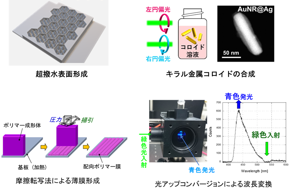 分子機能アセンブリ研究グループでは、新しい有機・高分子化合物やナノ・マイクロ粒子を合成し、それらの自己組織化による集積化構造形成、結晶や液晶などの秩序構造、界面における特異的挙動、あるいは光物理・光化学的性質に着目した研究を展開しています。これらの知見を活用して、次世代エレクトロニクスの基盤となる材料・技術の創出を目指しています。