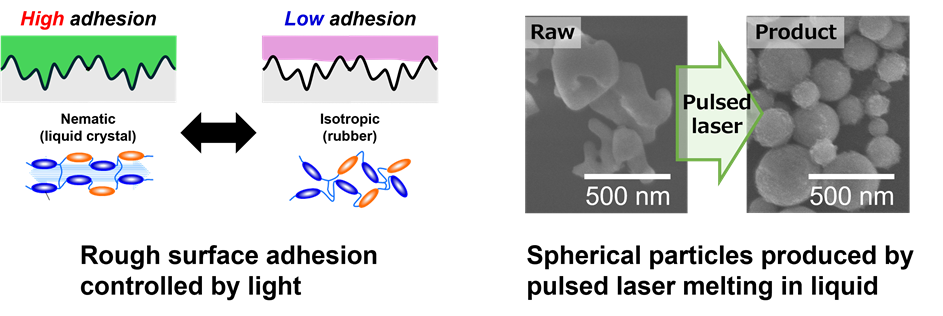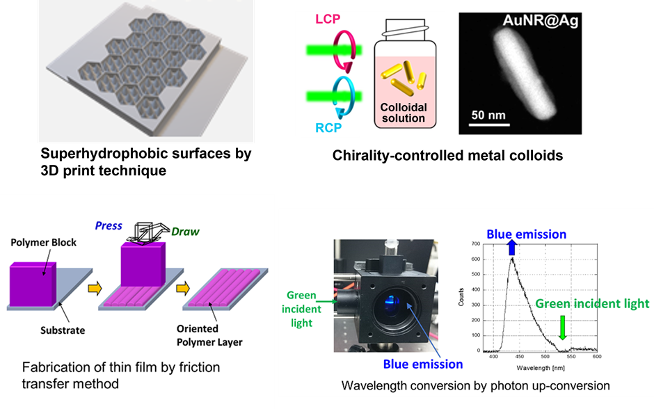We have been conducting basic research on the synthesis of novel organic and polymeric compounds as well as nano- and microparticles. Our focus is on their self-assembly into hierarchical structures, the formation of ordered phases such as crystals and liquid crystals, unique interfacial behaviors, and photophysical and photochemical properties. By leveraging these insights, we seek to develop new materials and technologies that could form the basis of next-generation electronics.