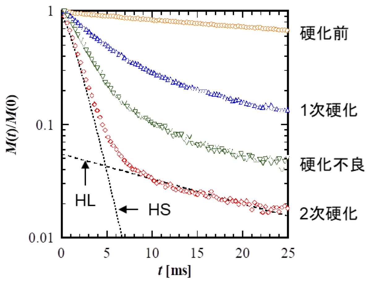 液状ゴムのスピン‐スピン緩和挙動を解析して硬化反応を評価する。