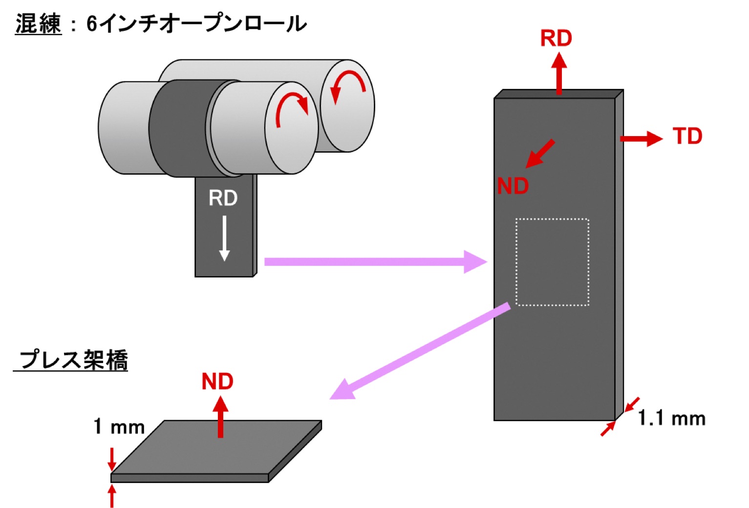 研磨面の電子像によってゴムと複合化されたカーボンナノファイバーの配向分布を評価する。