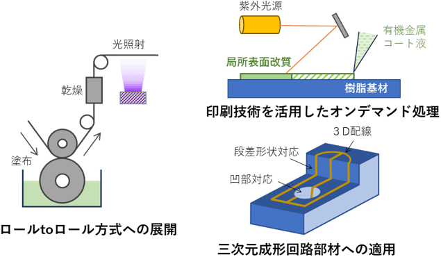 今回開発したフッ素樹脂の表面修飾技術は表面粗化度への影響を数nm程度に抑制できており、フッ素樹脂の応用が期待される次世代通信回路基板に要求される平滑性を満足するなど、従来の金属Na処理では適用できなかった用途への展開が期待されます。また、溶液塗布と紫外光照射の領域を必要な箇所に限定することもでき、消費する薬剤の量や廃液処理などによる環境負荷も抑制できる見込みです。今後は、大気開放環境下で簡便に実施可能な溶液プロセスである本手法の利点をより活用し、複雑形状対応や大面積処理、機能材料コーティングで、より広範な用途へ適応する予定です。高い平滑性を持ち接着性の高い表面を形成する本手法はインクを用いた印刷技術と親和性が高く、3D印刷技術の活用による局所処理や樹脂成型技術との融合が可能であると期待しています。また、本手法で強固に形成した無機金属膜をシード層として活用し、三次元成形回路部材への立体配線を直接形成するといった、溶液プロセスの強みを生かした応用展開を目指します(図4)。