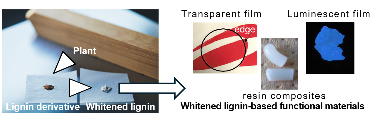 Lignin, an aromatic polymer derived from plants, has attracted attention as a functional material; however, its brown-black color has limited its design flexibility as materials. Our group has, for the first time in the world, developed novel technology to whiten various lignin derivatives obtained from cooking and simultaneous enzymatic saccharification and comminution. Using whitened lignin, we are developing transparent coating films as well as resin/clay composites with heat resistance, electric insulating, and luminescence properties.