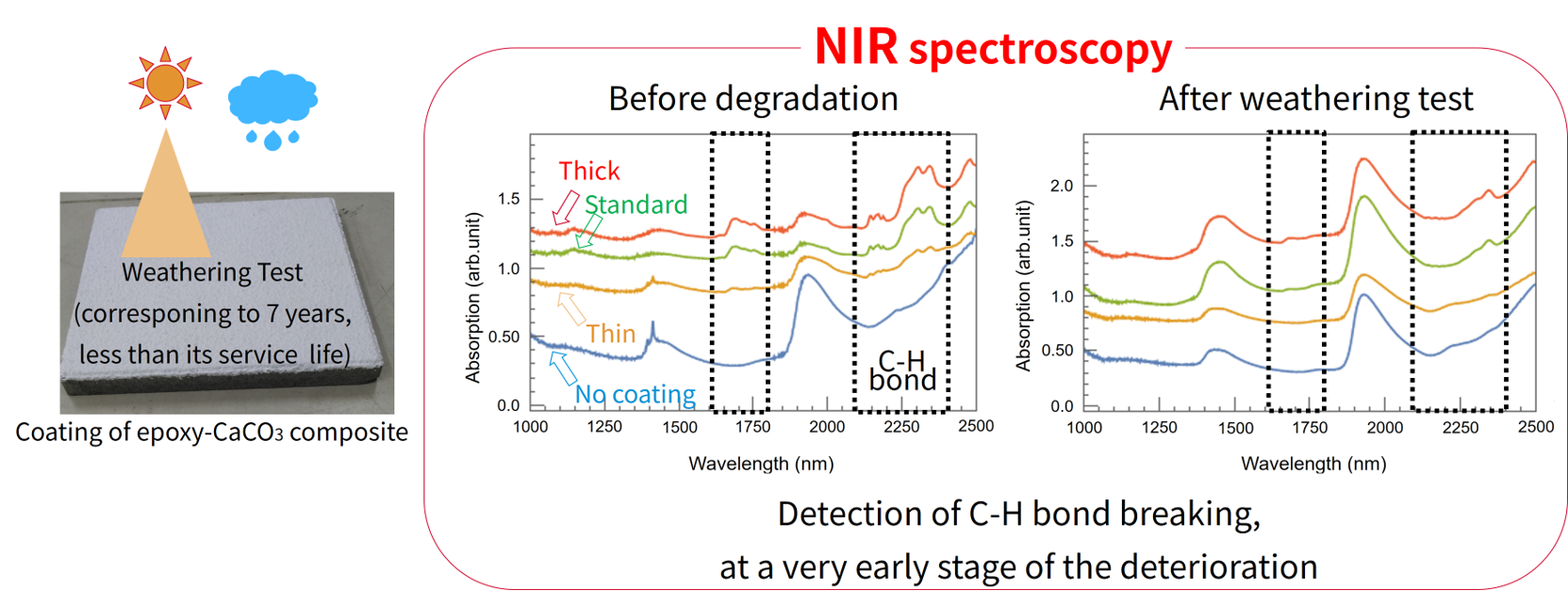 We develop diagnostic technologies in contactless manner to evaluate the degradation of organic polymers such as epoxy resins. Degradation of coatings materials in quite early-stage can be detected by using Near-infrared (NIR) spectroscopy. For example, we demonstrated that the surface damage of the coating caused by an accelerated weathering test was easily and non-invasively identified; the calcium carbonate particles were exposed due to the dissipation of epoxy resins on the surface.