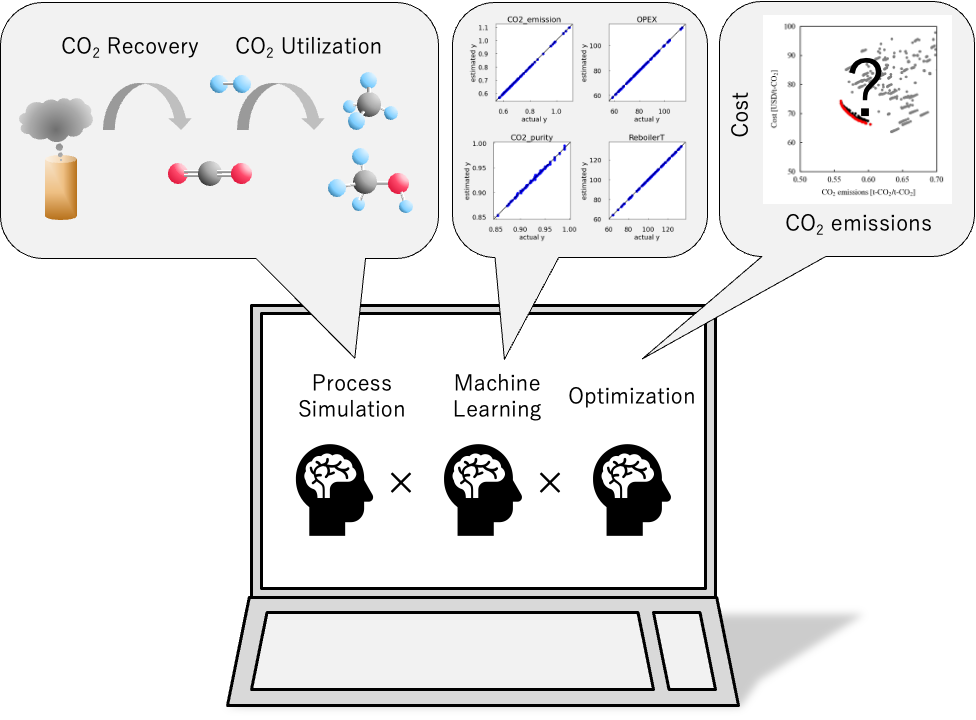 Based on life cycle assessment (LCA), the Energy-efficient Chemical Systems Research Group develops methodologies to design and evaluate optimal chemical processes from both CO2 emissions and economic perspectives. By applying multi-criteria evaluations—including CO2 emissions, production costs, and resource circulation rates—we accelerate the development of elemental technologies for materials and processes, contributing to the realization of the circular economy and CCUS.