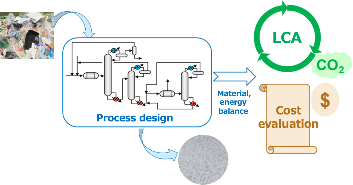 To support the circular economy, we perform process design, cost and carbon footprint assessments, and bottleneck analyses for individual waste plastic recycling processes. We also study appropriate material selection and strategies to reduce unnecessary heterogeneous materials in order to improve recycling rates.