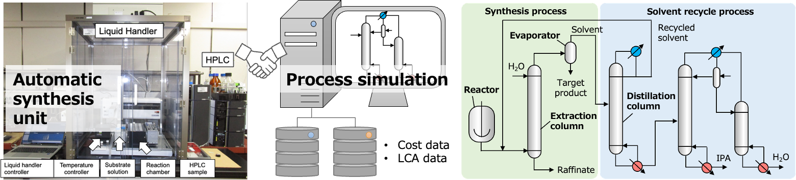We are developing solvent selection methods based on conceptual process design covering stages from reaction to waste solvent recycling. This approach aims to minimize CO2 emissions and production costs across chemical production processes. By designing circulation systems for waste solvents that are currently incinerated, we contribute to advancement of circular chemical manufacturing.
