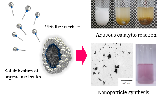 We have design and synthesis of metallosurfactants that enable to form metallic interface between different phases. Due to their self-assembling ability, they facilitate to form “nanometal” particles (e.g., gold, silver, and palladium). We are expecting that they are applicable to aqueous catalysis and antimicrobial agents.