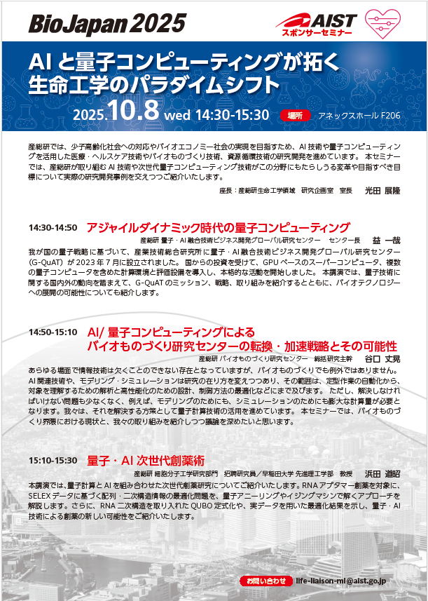 あらゆる場面で情報技術は欠くことのできない存在となっていますが、バイオものづくりでも例外ではありません。 AI関連技術や、モデリング・シミュレーションは研究の在り方を変えつつあり、その範囲は、定型作業の自動化から、対象を理解するための解析と高性能化のための設計、制御方法の最適化などにまで及びます。 ただし、解決しなければいけない問題も少なくなく、例えば、モデリングのためにも、シミュレーションのためにも膨大な計算量が必要となります。我々は、それを解決する方策として量子計算技術の活用を進めています。 本セミナーでは、バイオものづくり界隈における現状と、我々の取り組みを紹介しつつ議論を深めたいと思います。