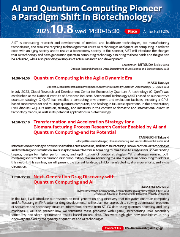 AIST is conducting research and development of medical and healthcare technologies, bio-manufacturing technologies, and resource recycling technologies that utilize AI technologies and quantum computing in order to cope with an aging society and to realize a bioeconomy society. In this seminar, AIST will introduce the changes that AI technology and next-generation quantum computing technology can bring to these fields and the goals to be achieved, while also providing examples of actual research and development.