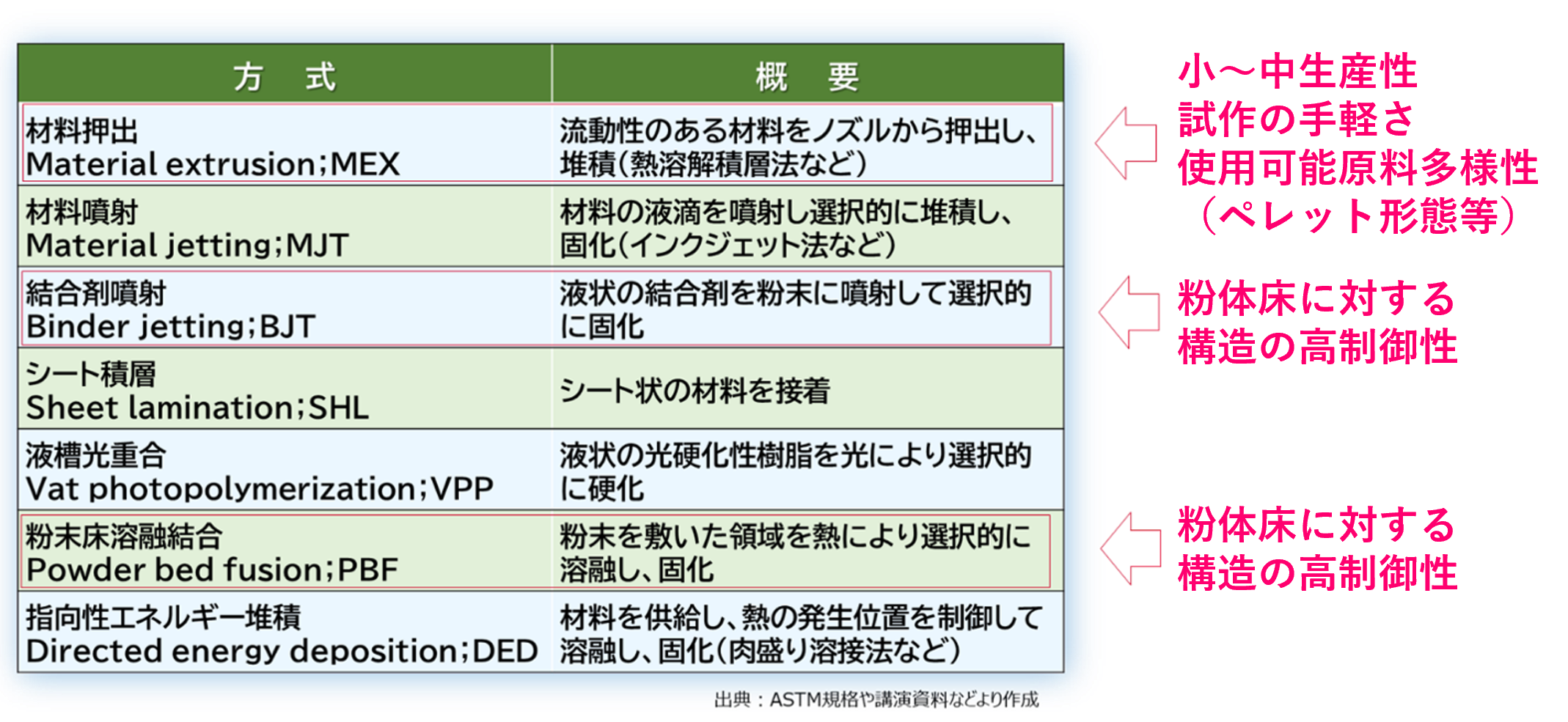 一般的な3Dプリンター(7方式)と試作工房で利用可能な3方式