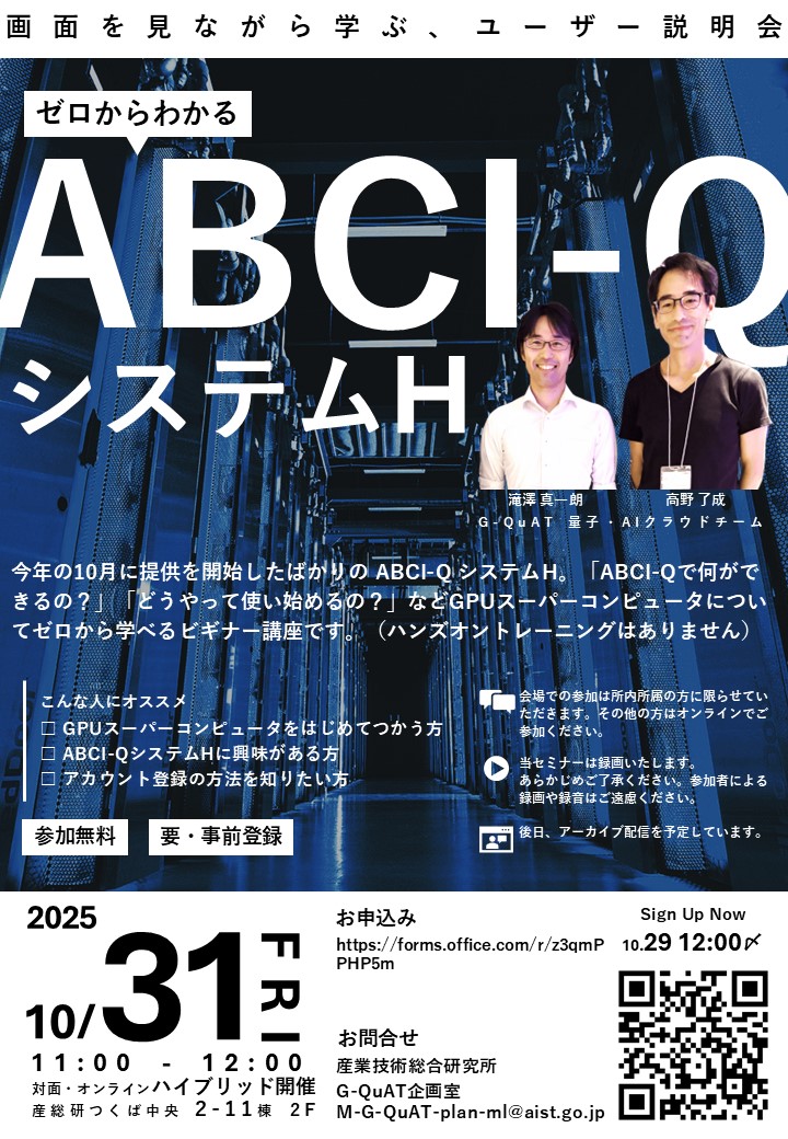 現在利用可能なGPU(NVIDIA H100 2020基)搭載のHigh Performance Computing System 「システムH」 について、ゼロから学べるビギナー向け講座を開講します。「ABCI-Qで何ができるの?」「どうやって使い始めるの?」など、量子・スーパーコンピューティングに関心のある方はぜひご参加ください!(ハンズオントレーニングはありません)