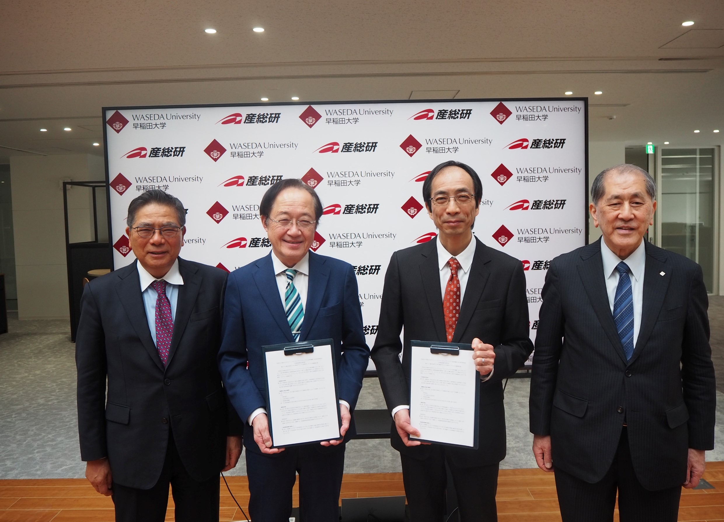 産総研 理事長 石村 和彦(左)、産総研G-QuAT センター長 益 一哉(左から二番目)と早大 GSC機構長 木村 啓二(右から二番目)、総長 田中 愛治(右)による締結式の様子