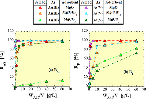 その一例として、Mg系吸着材によるAs-F同時除去試験で得られたAs除去率RAS及びF除去率RFを図1に示しています。吸着材添加濃度WAd0/Vの増加に伴いRAS及びRFともに増加していますが、両者ともに吸着材の種類だけでなく、Asの価数(3価と5価)によっても挙動が異なることがわかります。また、初期As濃度(CAS0)、初期F濃度(CF0)及び初期pH (pH0)の違いによってもRAS及びRFともに影響を受けることが確認されています。
