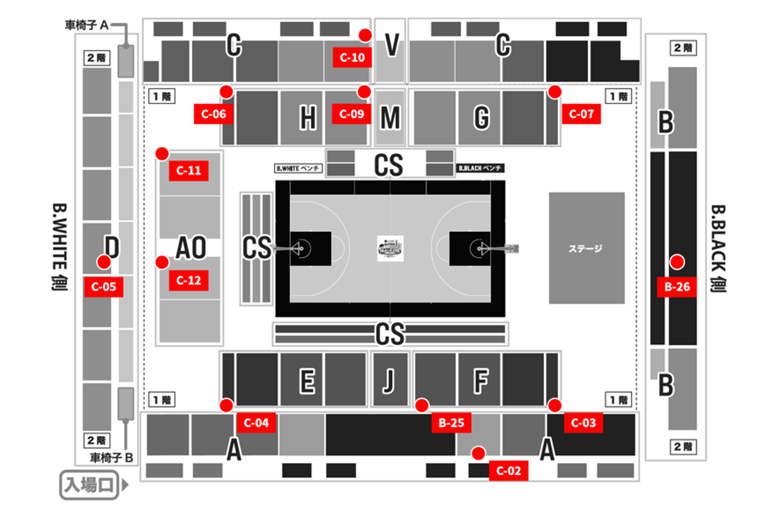オールスター会場において、13日は10台、14日は12台のCO2測定器を設置し、換気の状況を計測した。図1に設置場所、図2、3に1月13日(Day 1:Tip off 19:00)、14日(Day 2:Tip off 19:15)での測定場所を示す。
