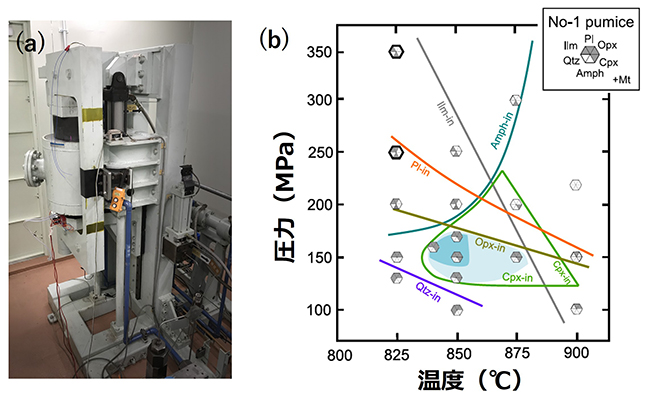 十和田カルデラの噴出物を用いた高温高圧実験の例.(a)実験に使用した内熱式ガス圧装置 .アルゴンガスを用いて最大約500 MPaまで等方加圧したうえで最大1500℃まで加熱できます.(b)高温高圧実験に基づいて描いたマグマの相平衡図.カルデラ噴火を起こした珪長質マグマの蓄積条件を図中の濃い青色の領域に決定しました.