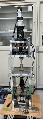 X線CT撮影による,変形のその場観察ができるよう⼩型化・軽量化を図った回転式摩擦試験機で す.外径 20mm・内径 10mmの円筒形試料に 5MPa の垂直応⼒をかけることが可能 です.回転式低速〜⾼速摩擦試験機ほどではあり ませんが,0.1µm/s から 1mm/s までの幅広いレンジの回転速度を与えることが可能です.現在,⼤型放射光施設 SPring-8のビームラインを使⽤しながら,断層の変形組織の発達や変形の局所化過程を観察しています.