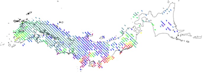 Stress map for the inland Japan (Uchide et al., 2022), which shows the principal azimuth of compressional stress.