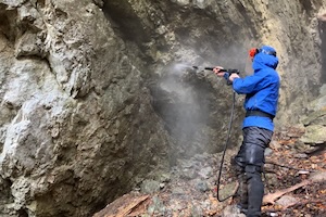 ⾼圧洗浄機を⽤いて露頭表⾯を洗浄し,断層帯中の微細構造を徹底 的に観察します. We use a high-pressure washer to clean the outcrop surface, allowing us to observe the microstructures within the fault zone in detail. |