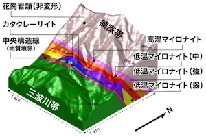 紀伊半島東部の中央構造線周辺の三次元断層帯モデル(Katori et al., 2021, JSG). 3D fault zone model around the Median Tectonic Line in the eastern Kii Peninsula (Katori et al., 2021, JSG). |