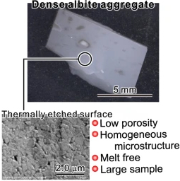 セラミックス分野の技術(固相焼結)を応用して合成した Naに富む斜長石(Shigematsu et al., 2022, PEPS). Albite-rich plagioclase synthesized using ceramics technology (solid-state sintering) (Shigematsu et al., 2022, PEPS). |