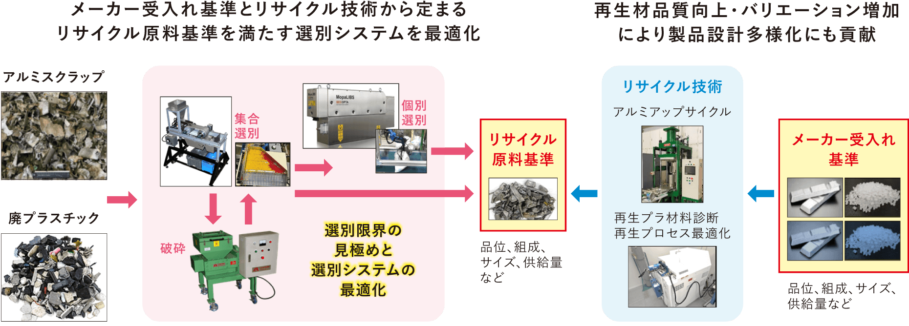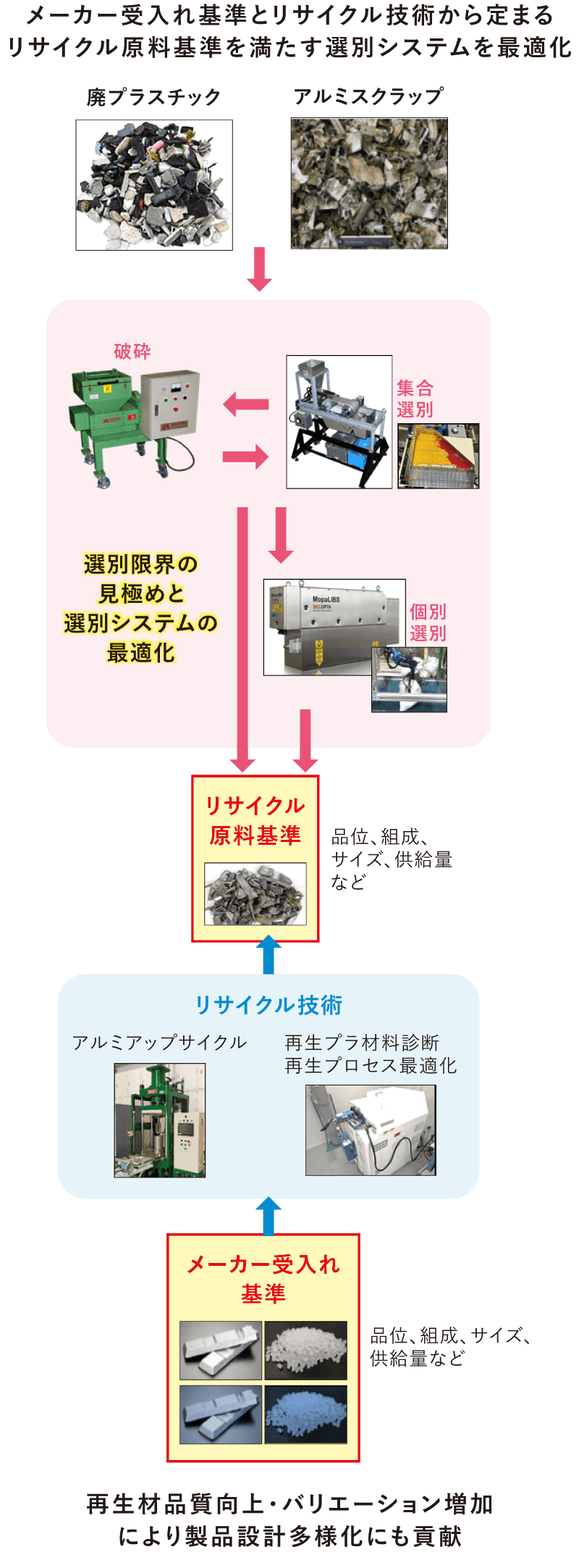 選別限界を見極めた上で、最適な選別システム(集合/個別選別の組合せ)を構築 - 更に再生材の品質向上・バリエーション増加につながれば、多様な製品設計にも貢献