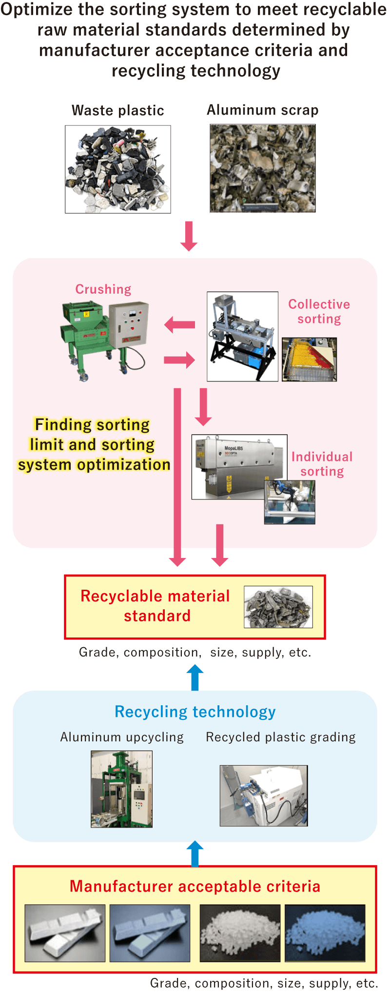 - AIST considers the characteristics of the incoming waste and the quality of the required recyclable raw materials, and after finding the sorting limits, builds the optimal sorting system (combination of collective/individual sorting).